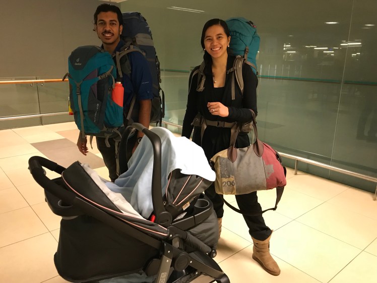 Arthur slept all the way through deplaning and immigration. I carried him the whole way, afraid he was going to wake up if I put him in the car seat that we received when we got off the plane. He stayed asleep, though. When I had to change his diaper and clothes, he finally woke up. Meanwhile, Sean went to grab the backpacks from the belt.