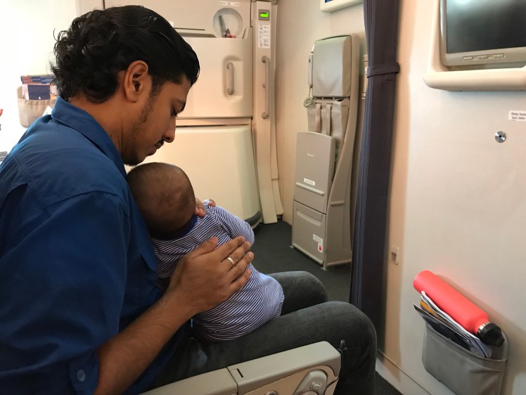 The worst part of the flight was the descent. Arthur was sleeping quite nicely when the pilot got on the PA system to announce that we were going to start our descent in 10 minutes. The loud announcement rudely awakened Arthur. I thought it was good timing. That way, I could feed him and hopefully, it would help him equalize. Unfortunately, I started the feeding too early. He finished feeding and then maybe two minutes later, just after he burped, we started the descent. It was fine for the first 30 seconds, and then Arthur started crying. And crying. And crying. Crying as if someone had physically hurt him. He screamed in pain. And tears started to well up. He looked at me hoping I would ease the pain. I, too, hugged him and kissed him hoping I would ease his pain. But I couldn’t do anything for him.