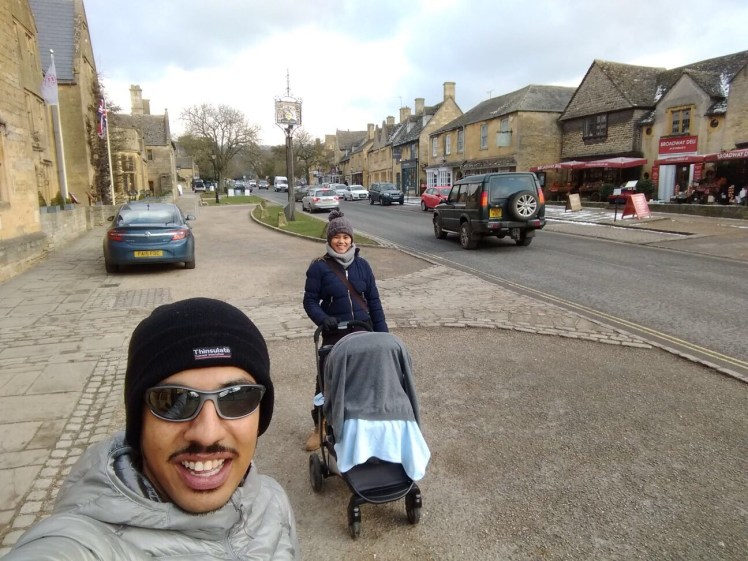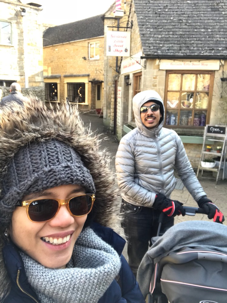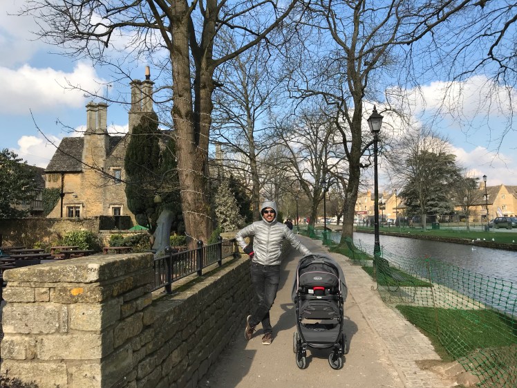 Unfortunately, we had to learn this the hard way. He cried and cried and cried once we arrived in Bourton-on-the-water. I got him out of his car seat to change his diaper and took him outside to put him in the stroller. He was unhappy. I should have fed him first. But by the time I got him back into the car, he was already crying really hard. So I had to soothe him first and then I was able to feed him. He was much more pleasant afterwards. But I could tell he was tired and wanted to sleep. So when I placed him back in the car seat, he started to squirm and protest again. I rocked the car seat back and forth to get him to quiet down a bit and then Sean took the car seat outside and placed it in the stroller. Sean then pushed the car seat around so that he could fall asleep. We had to endure about a minute of his soft cries before he fell asleep. Afterwards, we were able to walk around the town and visited some shops.