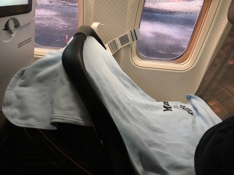Even though we were seated, the airplane door was still opened. It was so cold! Sean grabbed a blanket from the overhead compartment. And we waited. I was so glad Arthur was bundled up properly and that I did not have to take off layers for him at any point from the hotel to the plane.