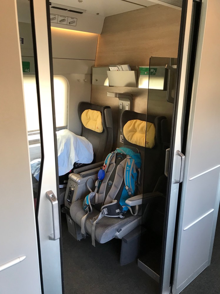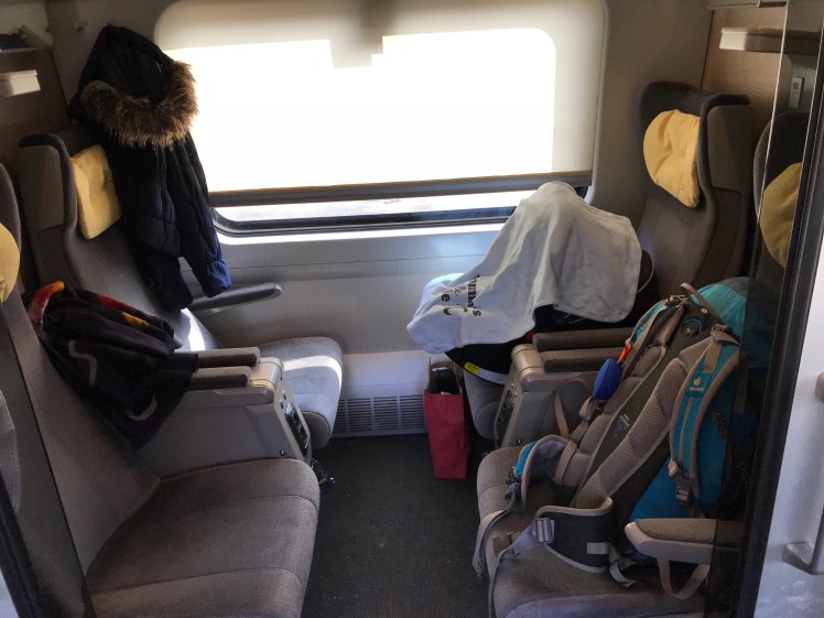 Once inside the station, we found our train information on the screen and made our way to Platform 3. On our ticket, there was a listing for number 4. We thought it was the sector number. It turned out to be the carriage number instead. We had been standing under sector 4 waiting for the train but when the train arrived, we had to walk about 200 meters down the platform to get to our carriage. No big deal. Arthur was awake in his car seat the whole time and he was not crying.