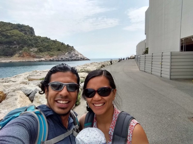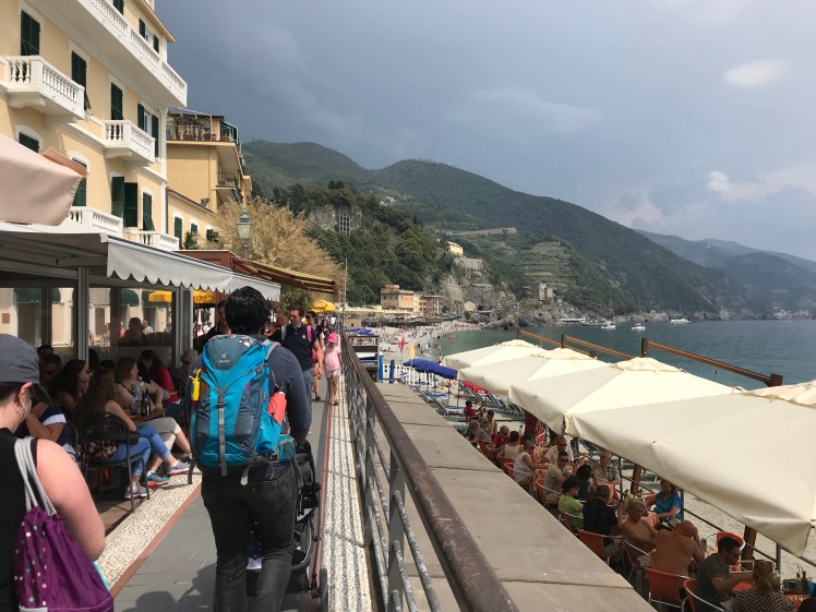 When we finally got off in Monterosso, the platform was quite small so people hurriedly walked towards the stairs to the village. The only way to get to town was to take the stairs down. There were no elevators or escalators. Arthur was sitting in the car seat when we took the stairs down. Sean carried the car seat with Arthur in it, and I carried the stroller frame.