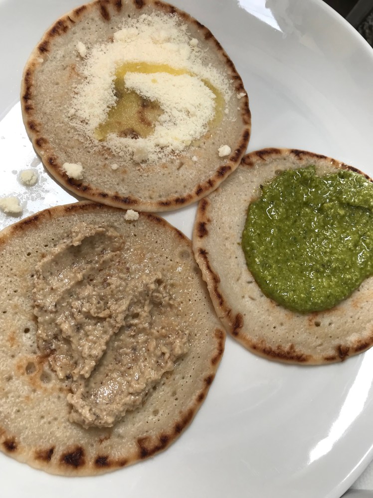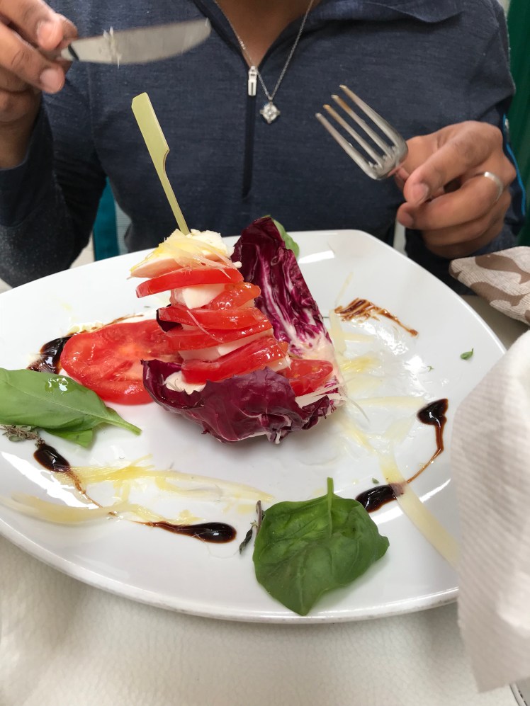 Sean didn’t have seafood. He had a caprese and a pancake-like meal. He said they were good.