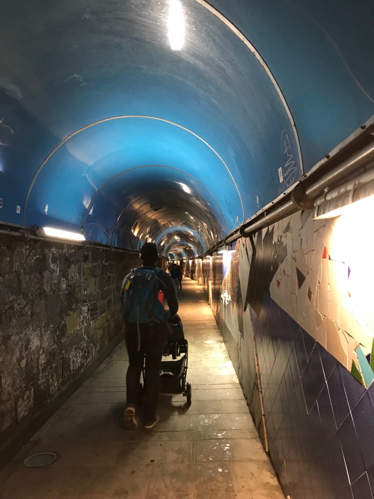 To get to the town, you’d have to walk through a tunnel. At the end of tunnel, we turned left, sat on a bench, and fed and changed Arthur. Then we continued our way to the sea.