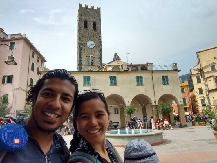 The train stopped on platform 2 in Riomaggiore which meant that we had direct access to the station and the square. No stairs required. Since it was still raining, we made our way towards a shelter. Then we changed Arthur’s diaper.