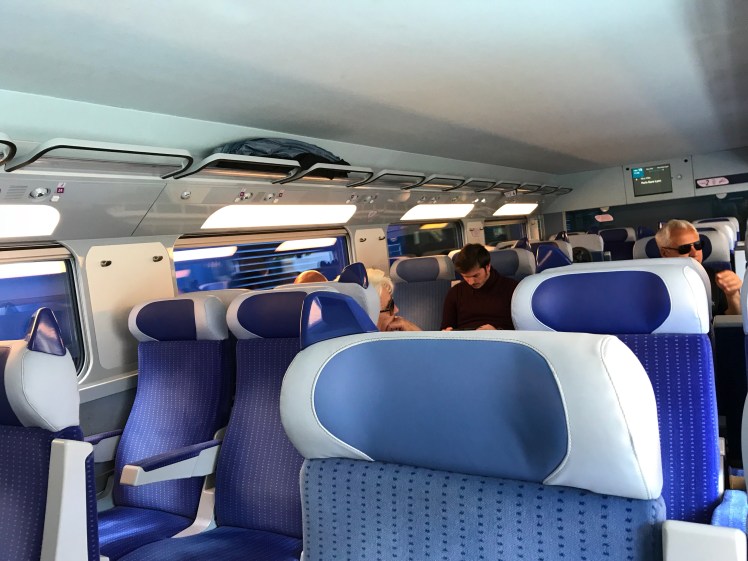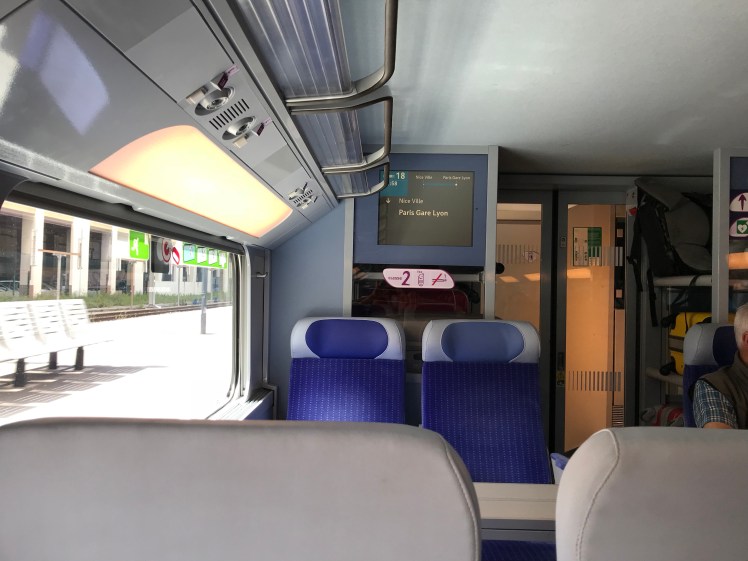 When passengers from Antibes got on the train, though, Sean had to move back to his assigned seat. We took Arthur out of the car seat and placed the car seat in the luggage compartment.